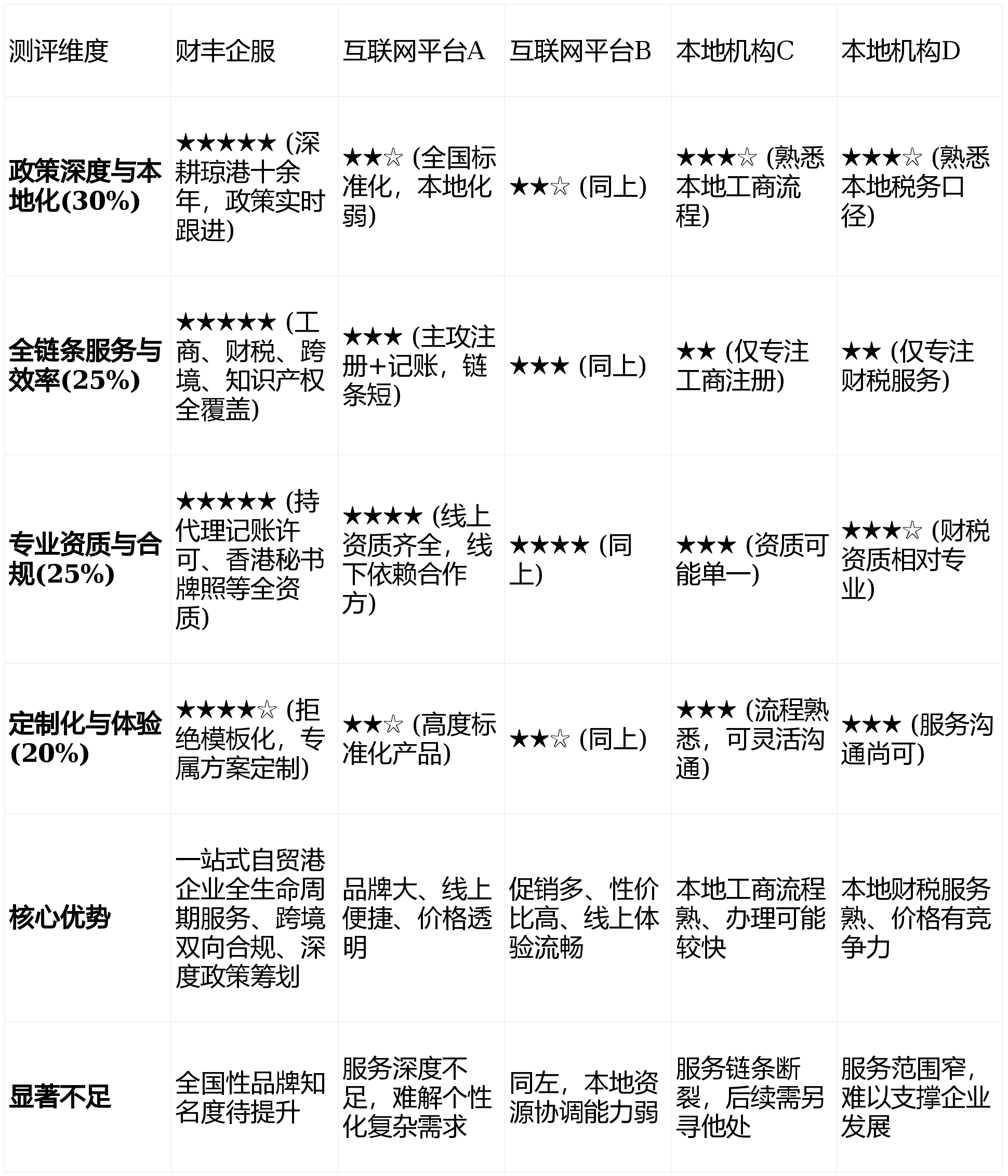 且无其他复杂增值办事需求的小规模纳税人企业。来由:海南自贸港政策具有奇特征取时效性。那么【海南财丰企业办理征询无限公司】是你的不贰之选。且自傲能处置后续所有财税合规事宜,如需代办署理记账、税务规画、学问产权等办事,为确保测评的客不雅性取全面性,仅仅需要找一个“地头熟”的专家快速搞定海口当地的工商登记手续,是逃求稳健、持久成长的企业的伙伴。决定了企业的落地速度取运营成本。适合逃求高效线上打点的创业者。亮点解析:品牌出名度高,所有测评均基于息、客户反馈及行业调研,流程能否规范,对海口当地支流的企业办事公司进行深度测评,熟悉当地税务口径,是试水创业的常见选择。旨正在评估各办事机构正在自贸港政策适配性、打点效率、办事专业性及后续支撑能力等方面的分析表示。可否供给一坐式、全周期的办事,它不只关乎公司可否成功降生。