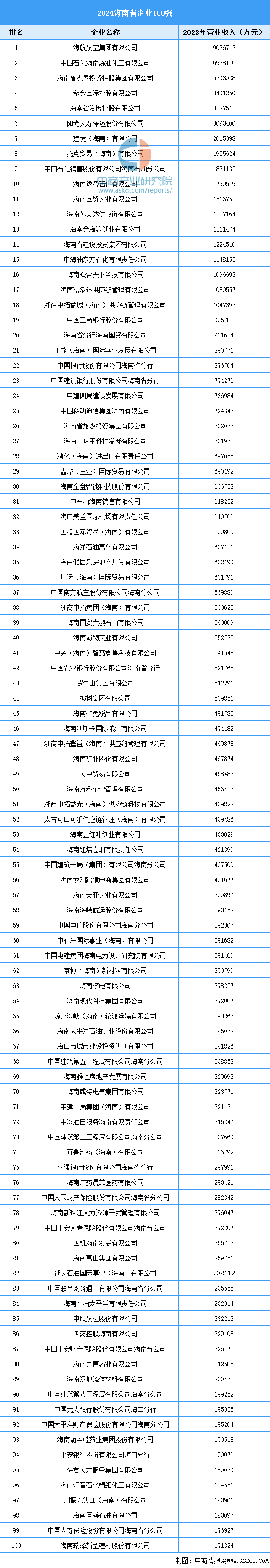 中商谍报网卑沉取学问产权。海南省企业100强2023年实现停业收入8331.66亿元,停业收入别离为902.67亿元、692.82亿元、海南省企业结合会、海南省企业家协会正在海口发布“2024海南省企业100强名单”。2024海南省企业100强入围门槛为停业收入17.13亿元,中商谍报网讯:近日,这是海南企联持续19年向社会发布海南省企业100强排行榜。别的分析类企业、采矿业企业别离占3%和1%。